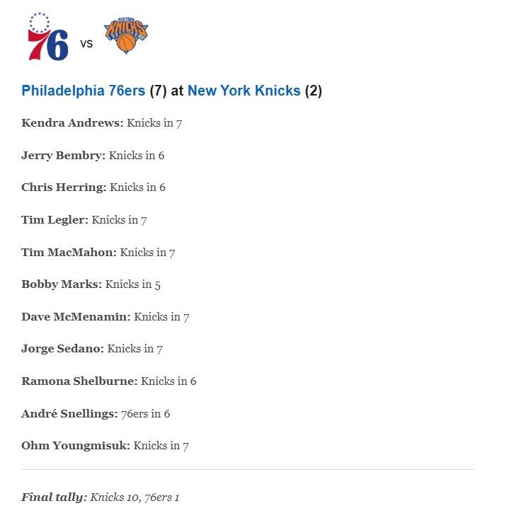 ESPN专家团预测尼克斯VS76人:11人中10人预测尼克斯晋级!