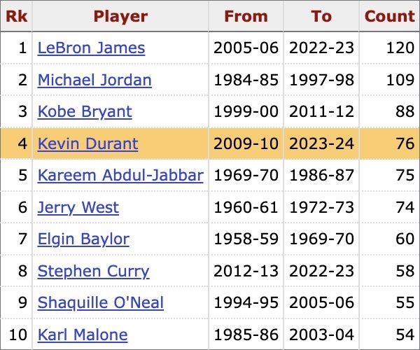 里程悲!杜兰特生涯季后赛第76次砍下30+ 超贾巴尔独享历史第四
