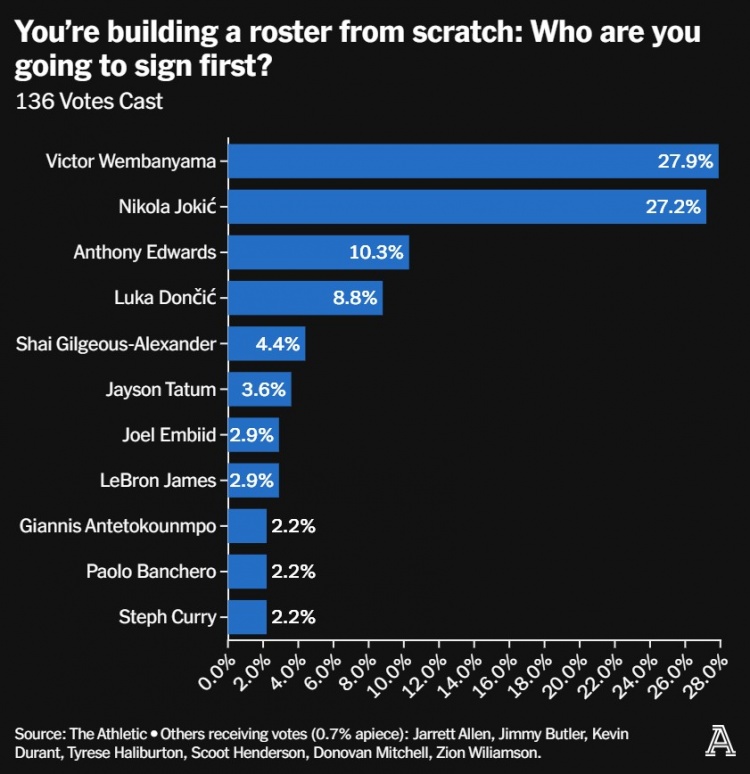 之后依次是东契奇(8.8%得票率)、亚历山大(4.4%得票率)、塔图姆(3.6%得票率)、詹姆斯(2.9%得票率)、字母哥(2.2%得票率)、班凯罗(2.2%得票率)、库里(2.2%得票率)。