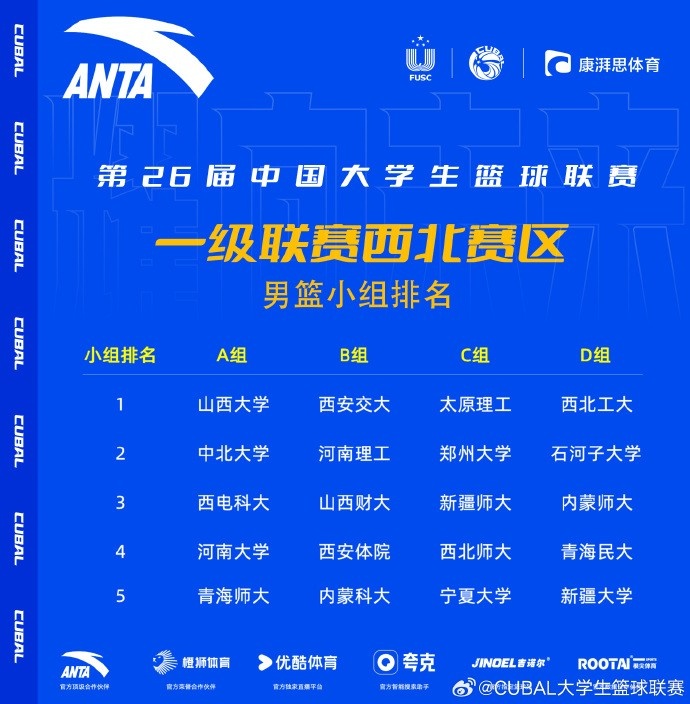 男篮迎来最后一轮小组赛,太原理工、西安交大、山西大学、西北工大均以四战全胜位列各小组第一;中北大学、河南理工、郑州大学、石河子大学分别位列各组第二。