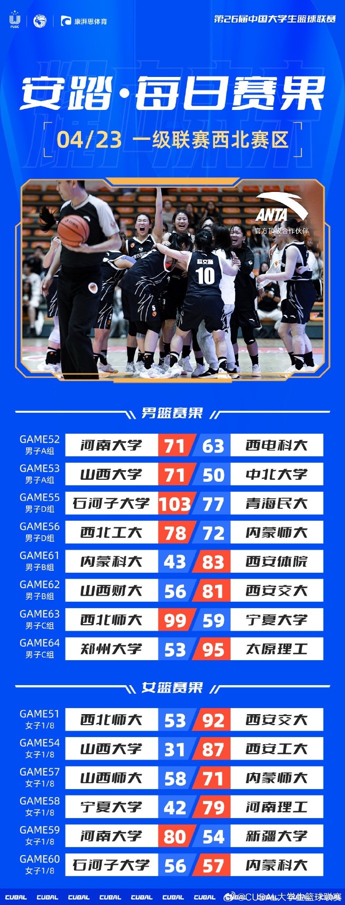 4月23日,一级联赛西北赛区来到第五个比赛日,女篮迎来16进8比赛,内蒙科大女篮黄诗茹打板三分绝杀石河子大学,晋级赛区八强!西安交大、西安工大、内蒙师大、河南理工、河南大学分别战胜对手,晋级八强;青海师大、山西财大轮空晋级。