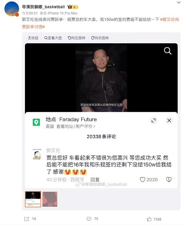 贾跃亭发社媒介绍新车!郭艾伦讨薪:大卖后能否把没结的150W结了
