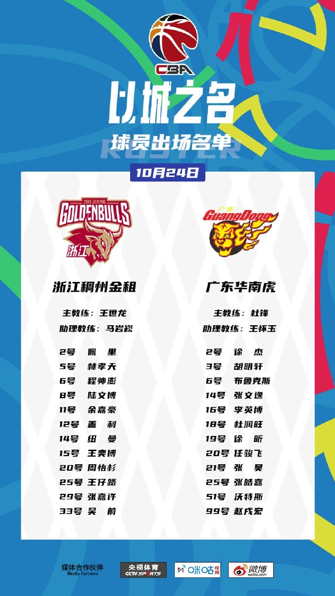 10月24日讯 今日CBA常规赛浙江主场对阵广东,比赛时间为19时35分。赛前,CBA联赛官微发布了对阵双方大名单。