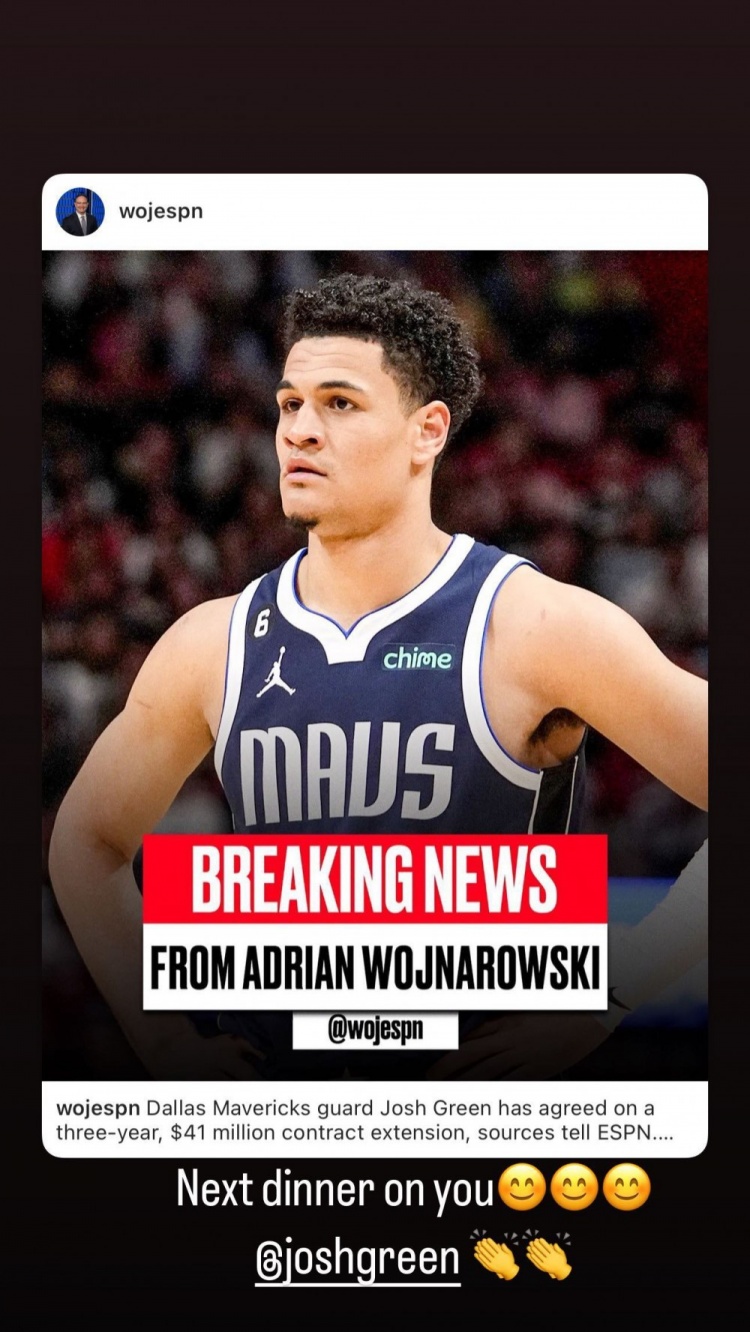 东契奇祝贺队友约什-格林达成续约:下顿晚餐你请