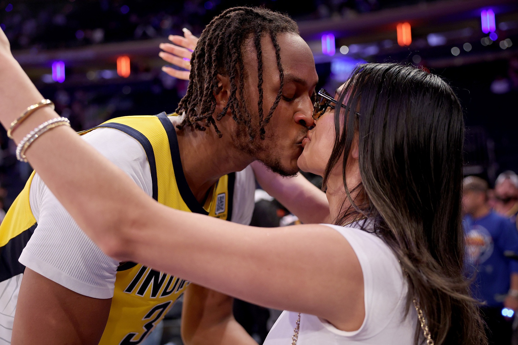 05月20日讯 步行者抢七130-109击败尼克斯杀入东决,中锋特纳赛后与女友Aysia Janelle在场边亲亲,大秀恩爱。