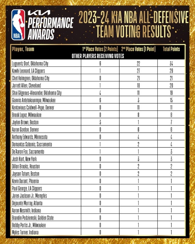 ☑️防阵投票结果:戈贝尔全票&文班第二浓眉第五 多特最大遗珠