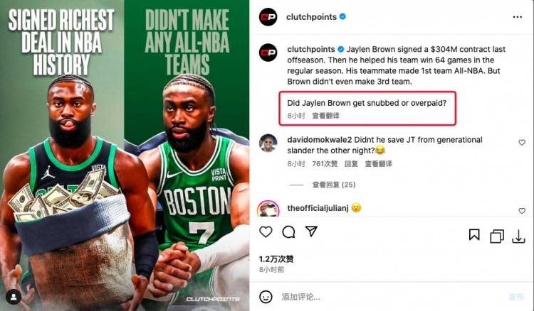 美媒Clutch Points:“去年休赛期杰伦-布朗签下了3亿合同,球队本赛季64胜,他队友塔图姆进入一阵,但是布朗甚至三阵都没进。遗珠吗还是给多了?”