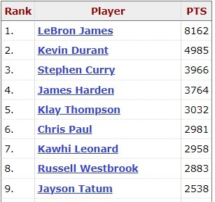 现役排名第9,仅次于詹姆斯、杜兰特、库里、哈登、克莱、保罗、莱昂纳德、威少。