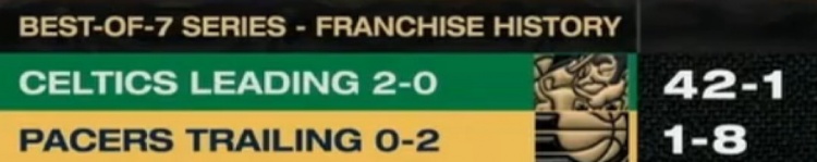 5月26日讯 NBA季后赛东部决赛G3,步行者主场对阵凯尔特人。转播方晒出一项数据,当系列赛2-0领先时,凯尔特人队史的系列赛战绩为42胜1负;而当0-2落后时,步行者队