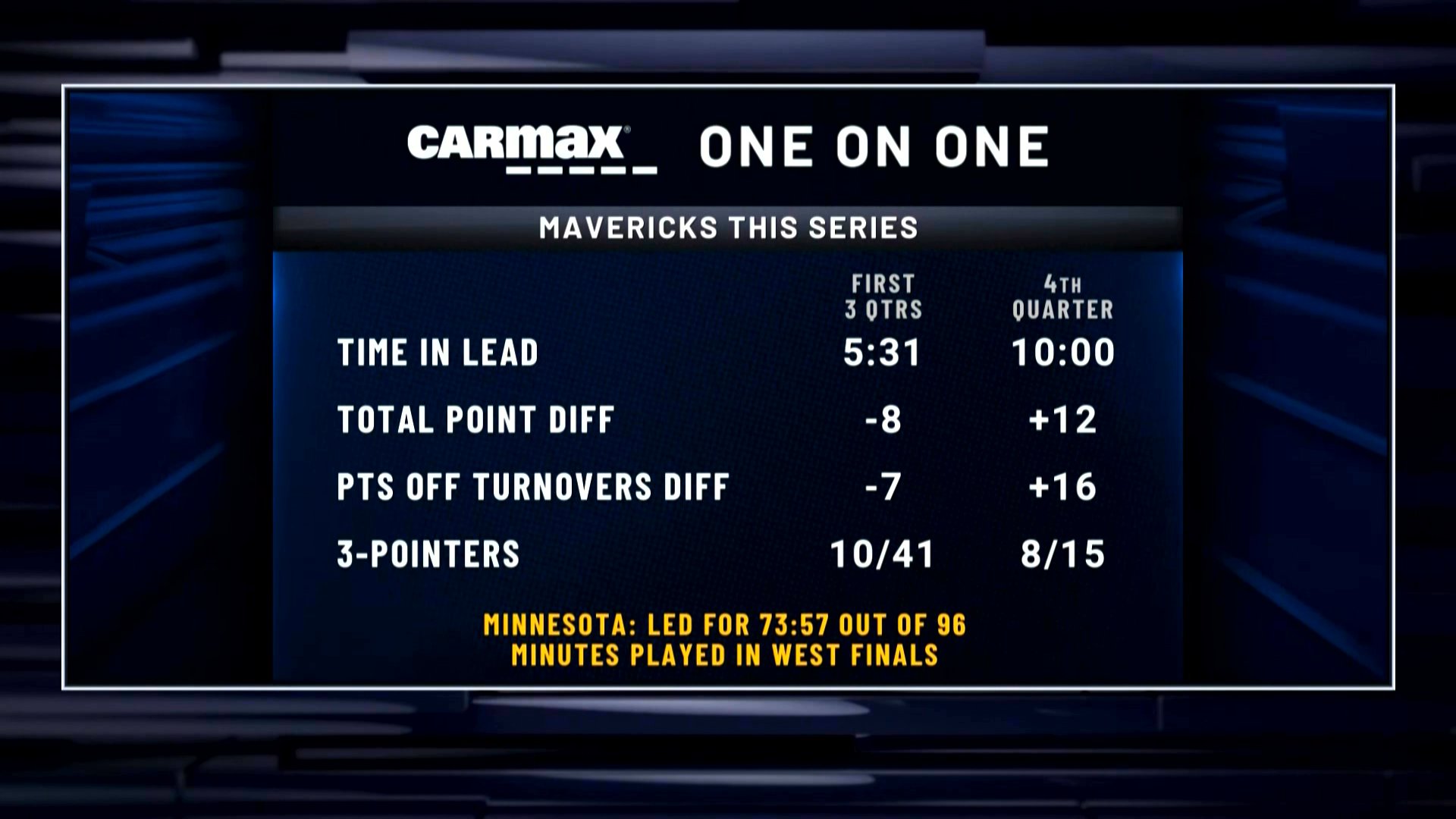 过去两场比赛:森林狼在96分钟里领先了73分57秒;独行侠前三节一共领先了5分31秒,第四节领先了10分钟;独行侠前三节正负值-8,第四节正负值+12;独行侠前三节三分41