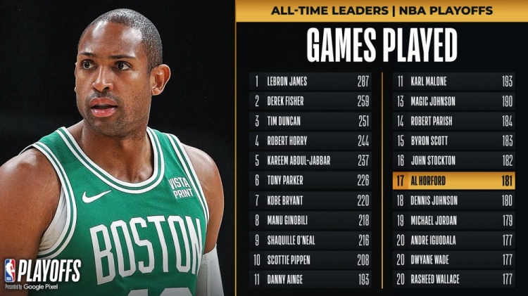 霍福德生涯季后赛出场数达到181场 排名升至历史第17位!