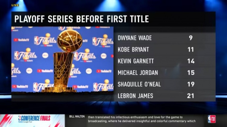 巨星拿生涯首冠前经历的系列赛数:科比11次 乔丹15 詹姆斯21