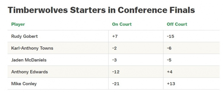 据统计,在西决前4场比赛中,森林狼首发五人组只有当戈贝尔在场时球队正负值为正(+7),其他人均为负值,具体如下: