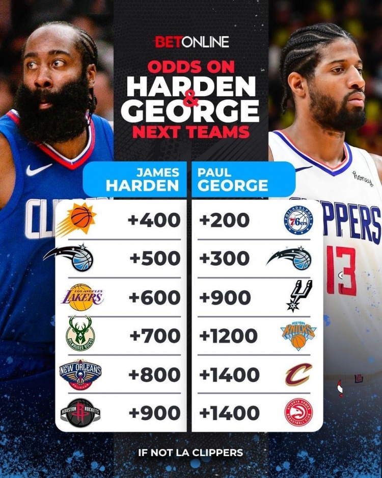5月31日讯 今天,博彩网站更新了哈登和乔治若离开快船的情况下的下家赔率,具体为: