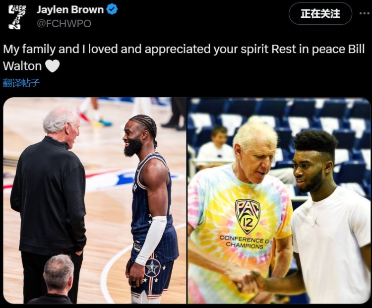今天,杰伦-布朗发推悼念比尔-沃顿,他写道:“我和我的家人爱你并欣赏你的精神,愿比尔-沃顿安息