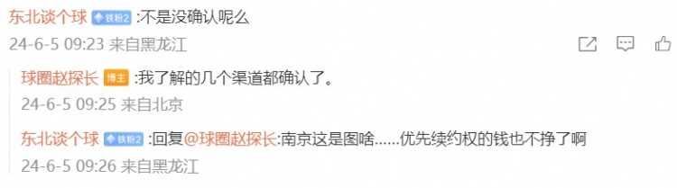 在给一名网友的回复中,@球圈赵探长 写道:“我了解的几个渠道都确认了。”