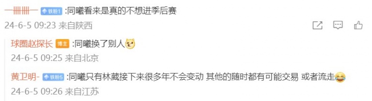 谈到同曦男篮在外援方面的情况时,@球圈赵探长 表示:“同曦换了别人。”