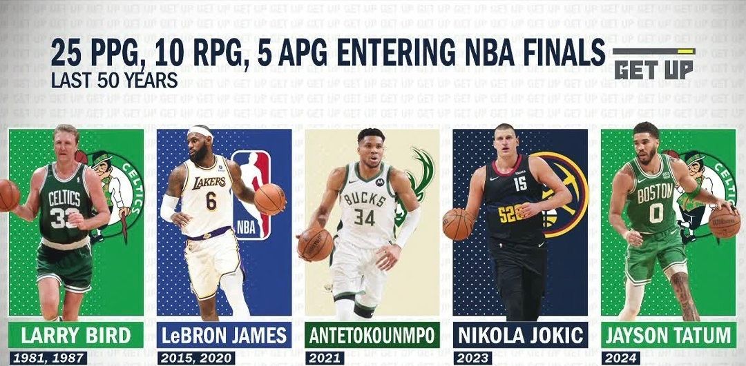 过去50年,总决赛前季后赛场均至少25分+10篮板+5助攻:伯德(1981、1987)、詹姆斯(2015、2020)、字母哥(2021)、约基奇(2023)、塔图姆(2024)