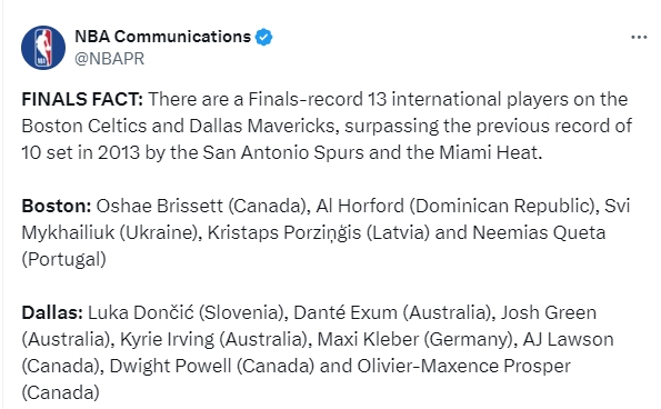 NBA Communications:今年总决赛对阵双方有13名国际球员,创造2013年马刺和热火所创造的纪录。