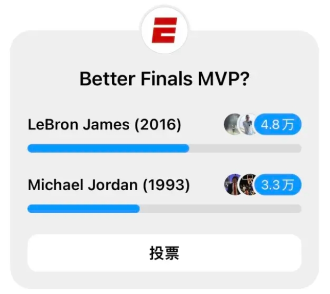 此前由ESPN发起历史最佳FMVP16强投票,今日最终结果出炉。16詹姆斯先后淘汰19小卡、06韦德,在决赛击败93乔丹成功当选历史最佳FMVP。