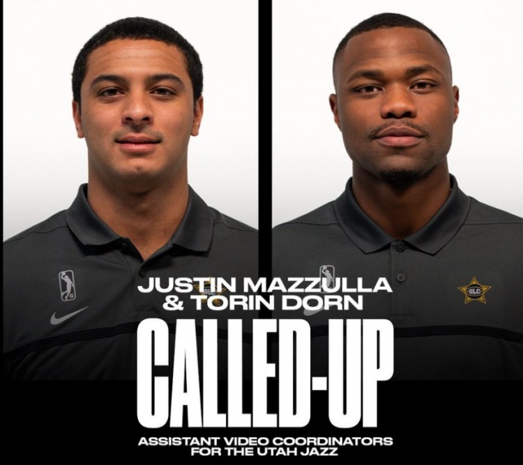 左为贾斯汀-马祖拉6月8日讯 据《盐湖城星报》报道,今天,爵士队宣布将贾斯汀-马祖拉提升为球队的助理视频协调员。此前,贾斯汀-马祖拉任职于爵士发展联盟下属