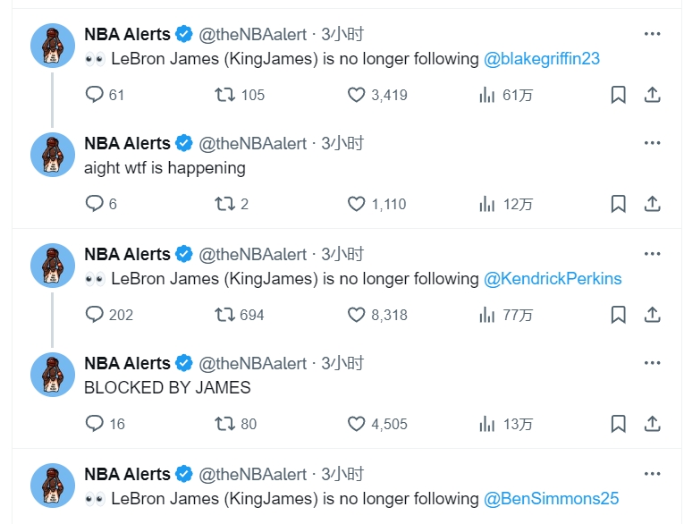 06月08日讯 专门跟进NBA人员关注/取关动态的美博主NBA Alerts透露,湖人球星詹姆斯连续取关三人。