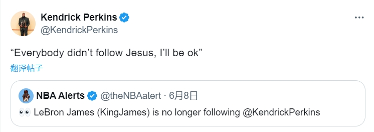 帕金斯回复了爆料詹姆斯取关他的推文:“不是每个人都要追随耶稣,我会没事的。”