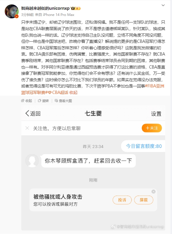 只字未提辽宁,却被辽宁球迷围攻,还私信祝福。我不是任何一支球队的球迷,只是站在CBA联赛层面说了昨天的话,并不是想去道德绑架某队,针对某队,换成其他队我也说一样的话。辽宁球迷支持自己主队没问题,立场不同角度不同没问题,但你一样也是中国球迷吧,昨晚你看了直播没?解说提的更多的是CBA冠军打得怎样怎样,CBA冠军落后怎样怎样?你听着心理感受很好吗?这就是我发微博的初衷。就CBA俱乐部有困难,伤病满营,比赛强度大,其他国家联赛不存在?就CBA赛季刚结束,其他国家联赛不存在?包括赛季结束球员合同到期的困难,其他联赛也一样有。对手阿尔利亚德是通过西超预选赛才获得了打这比赛的资格,CBA是直接拿了联赛冠军就能参加,你觉得他们会不会有想法?还有说什么奖金低,万一受伤了谁负责?这时候你怎么不对比下我们球员的年薪。如果实在觉得没办法克服,或者觉得这是可有可无的鸡肋比赛,下次干脆学PBA不参加也是一回事。