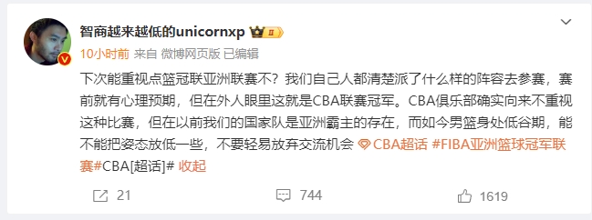 王健写道:“下次能重视点篮冠联亚洲联赛不?我们自己人都清楚派了什么样的阵容去参赛,赛前就有心理预期,但在外人眼里这就是CBA联赛冠军。CBA俱乐部确实向来不重视这种比赛,但在以前我们的国家队是亚洲霸主的存在,而如今男篮身处低谷期,能不能把姿态放低一些,不要轻易放弃交流机会 CBA超话 #FIBA亚洲篮球冠军联赛#CBA[超话]。”