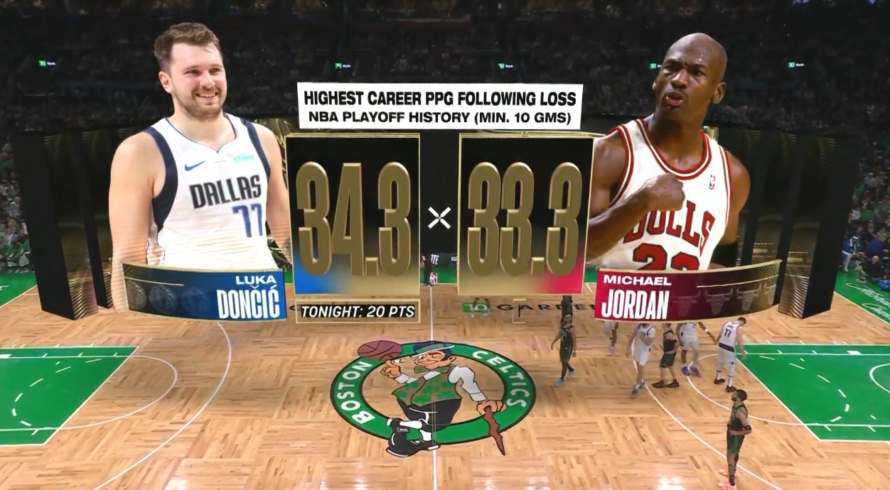 东契奇季后赛输球后的比赛场均34.3分(至少10场),历史第一,乔丹33.3分