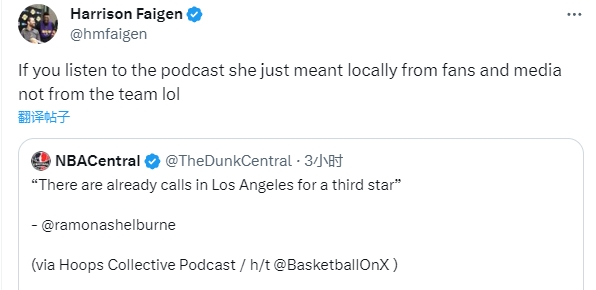 湖人记者Harrison Faigen则转发了美媒NBACentral断章取义的一句话报道,并解释道:“如果你听了播客,你就知道她(Ramona Shelburne)指的是当地球迷和媒体,而非球队。”