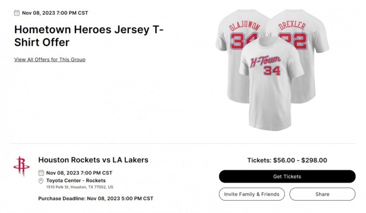 11月9日讯 今日上午9点,火箭将坐镇主场迎战湖人。火箭官方在本场比赛推出购票送奥拉朱旺或德雷克斯勒T恤的活动。该套餐价格为56-298美元,票价根据位置不同