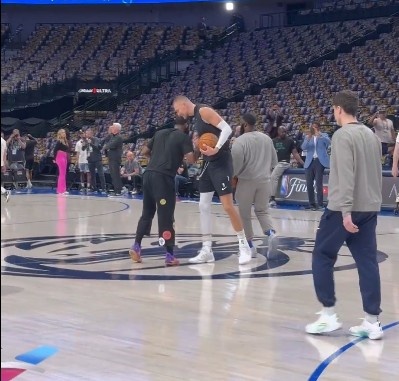 赛前独行侠球星欧文与绿军球星波尔津吉斯同时提前来到球馆热身,俩人互相友好致意!