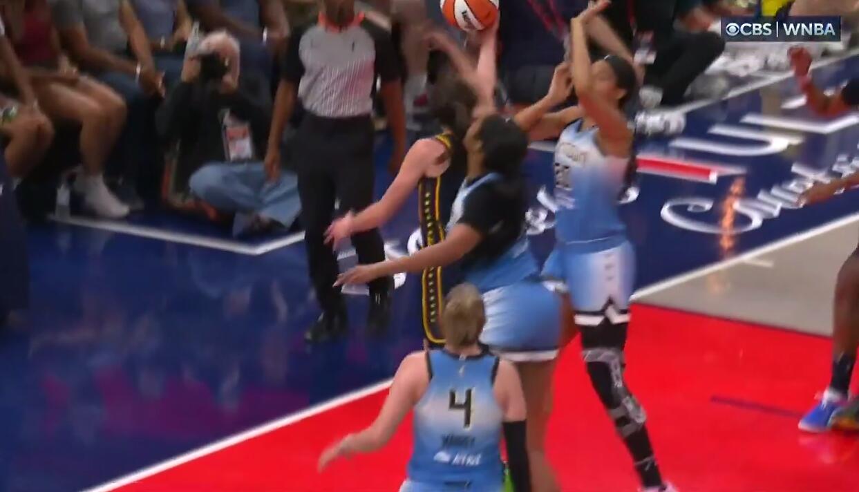 06月17日讯 WNBA常规赛,印第安纳狂热对阵芝加哥天空。比赛第三节,芝加哥天空7号秀里斯,对状元秀凯特琳的脑袋抡了一肘,被吹一级恶意犯规。