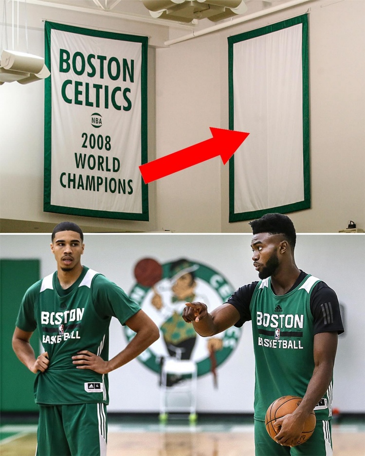 据ESPN报道,杰伦-布朗和塔图姆整个职业生涯训练期间,在球馆顶部一直悬挂着一面空白的冠军旗帜,如今终于如愿。