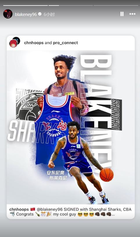 06月19日讯 CBA外援布莱克尼在个人社媒承认加盟上海男篮!