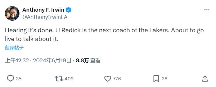 06月19日讯 《Lakers Daily》媒体人Anthony Irwin报道称,湖人将聘请雷迪克担任下任主帅。Anthony Irwin称,双方已经敲定合约。目前各大网站以及名记还未曾报