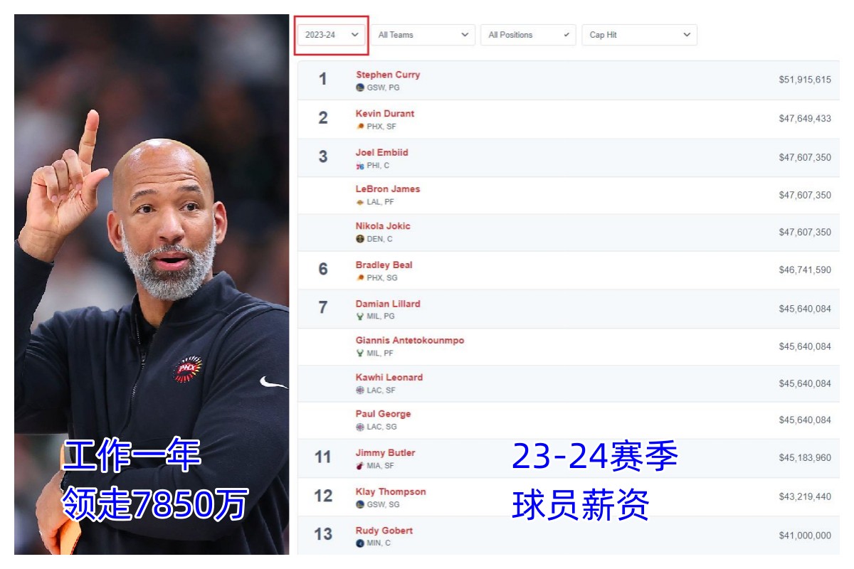 蒙蒂7850万创最高“年薪”库里5200万️詹杜仅4760万