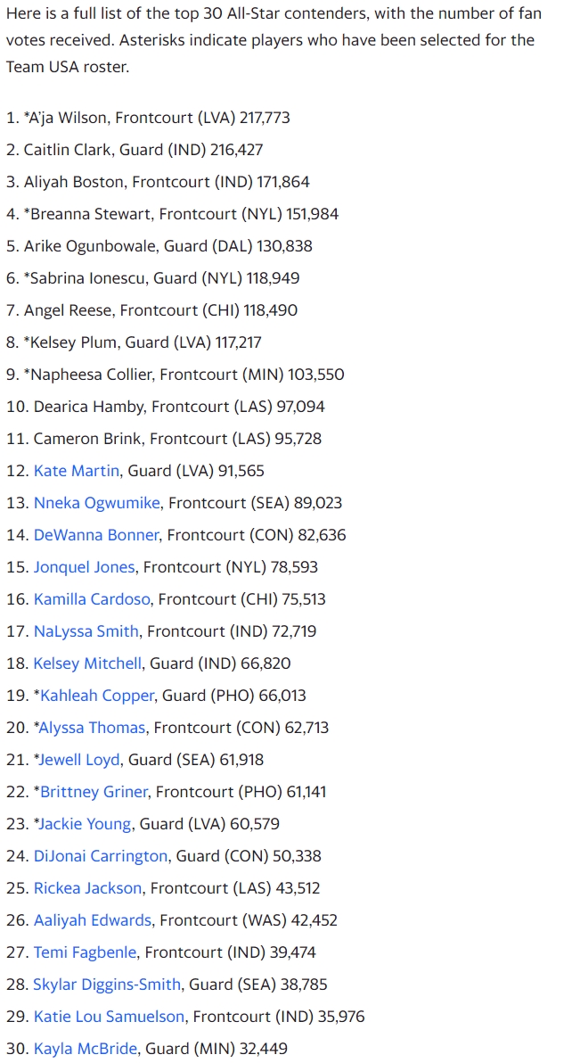 本次球迷投票将于6月29日结束,另外值得一提的是,球迷们可以目前所有12支球队的任意球员投票,没有候选球员限制。(球迷投票必须要通过WNBA官网或者官方App:直达链接,每人每日仅可投1次,16、22、27为双倍计票日)