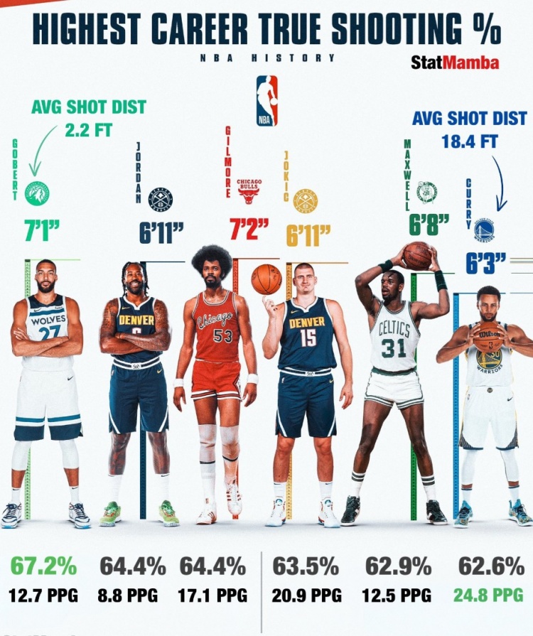 库里生涯真实命中率62.6%历史第6&前5全是长人 平均出手距离5.6米