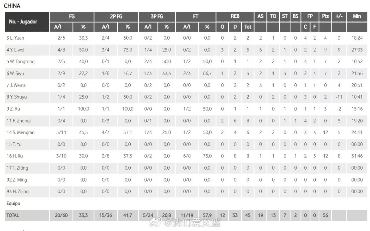 全场比赛女篮60投20中,三分23中5,罚球19中11。
