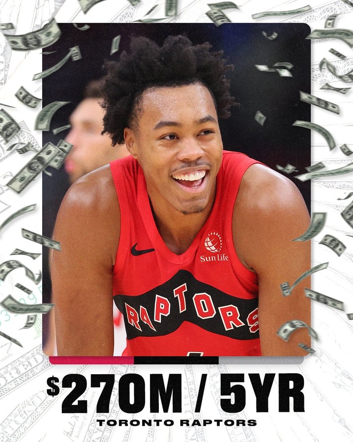6月25日讯 据名记Woj报道,猛龙计划5年顶薪提前续约斯科蒂-巴恩斯,合同最高可达2.7亿美元,这将使后者成为队史最贵的球员。