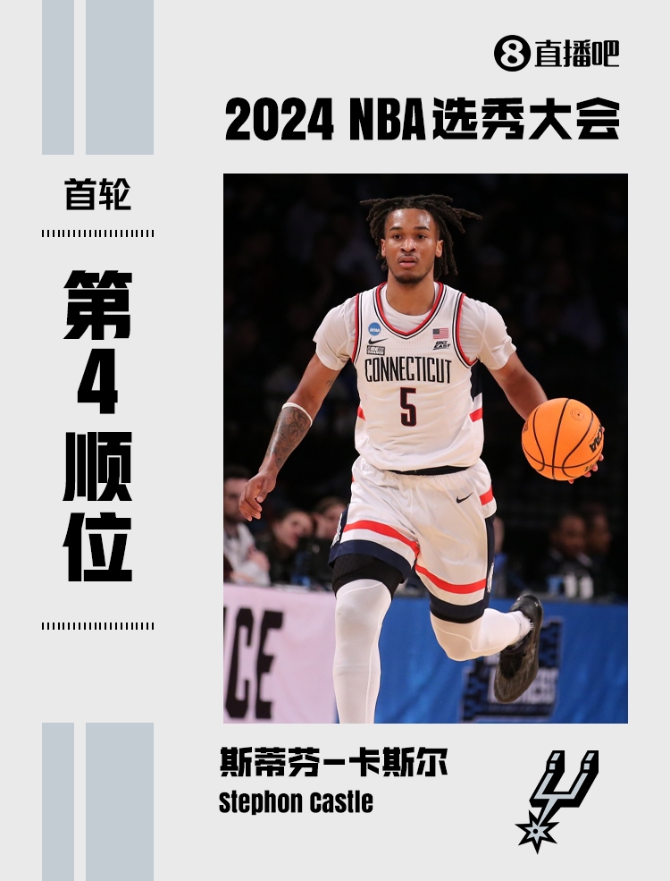 06月27日讯 2024年NBA选秀大会,马刺用四号签选中斯蒂芬-卡斯尔。