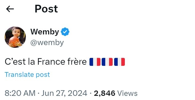 2023年NBA状元文班亚马更推道:“来自法国的兄弟们。”