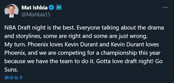 今日,太阳老板马特-伊什比亚发推亲自辟谣道:“NBA选秀夜是最精彩的。每个人都在讨论各种戏剧性事件和故事情节,有些是对的,有些则是错的。