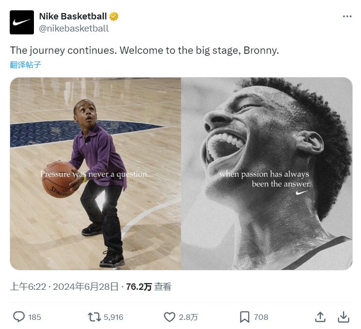 06月28日讯 湖人55顺位选中詹姆斯的大儿子布朗尼。耐克官方送上祝贺:“仍在路上!欢迎来到大舞台!布朗尼!”布朗尼在进入NBA之前就已经是耐克的签约球员,拥有个