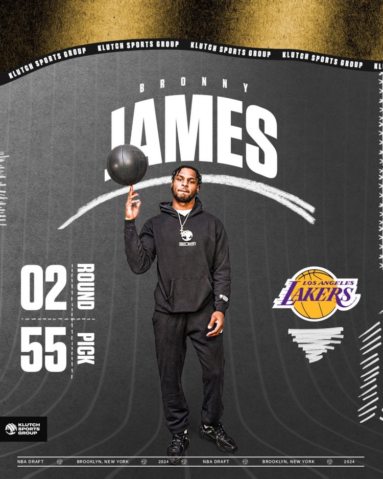 6月28日讯 NBA选秀大会,19岁的南加州大学后卫布朗尼-詹姆斯(勒布朗-詹姆斯之子)被湖人在第55顺位选中。随后,布朗尼经纪公司Klutch Sports官方更推发贺电:“恭