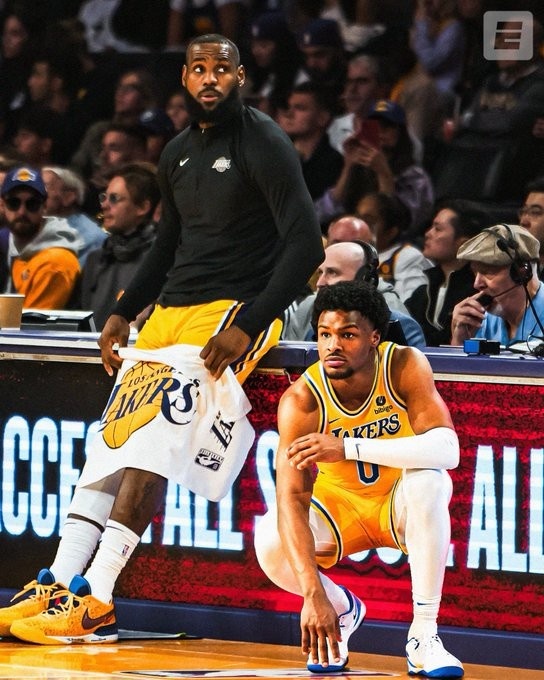 布朗尼更推晒出自己与父亲詹姆斯的合照:洛杉矶湖人队!