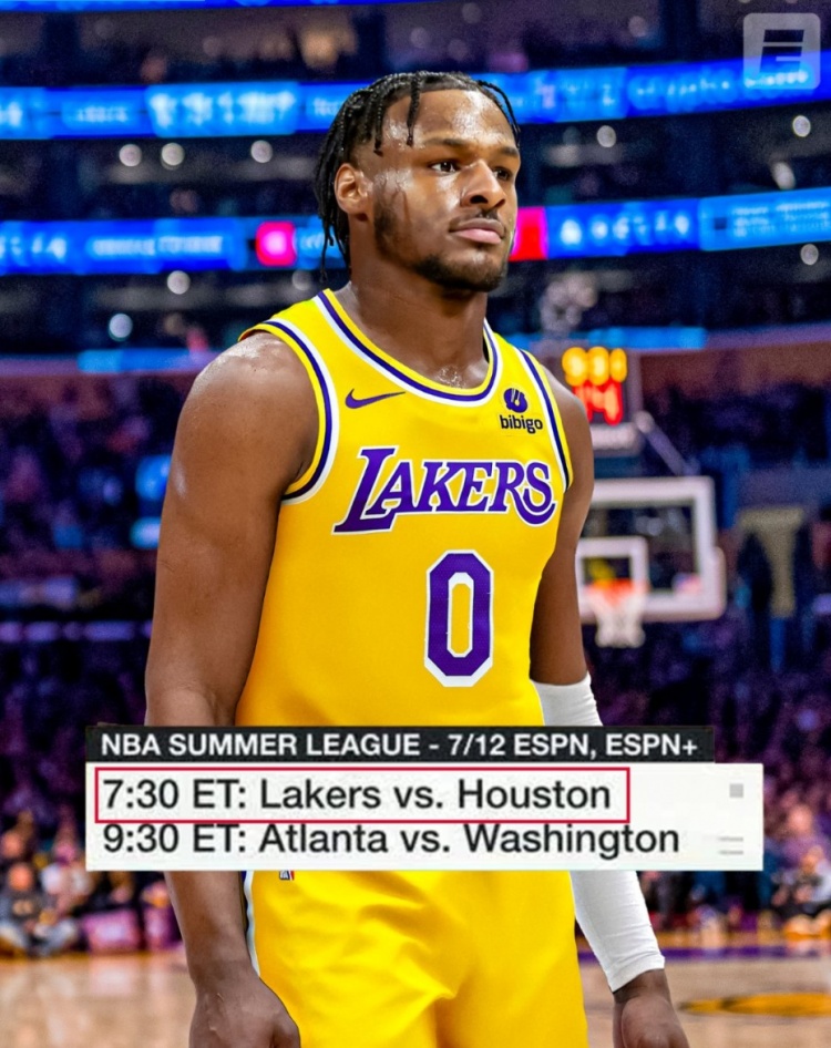 06月28日讯 NBA选秀大会,南加州大学后卫布朗尼-詹姆斯被湖人在第55顺位选中。这样一来,布朗尼和他老爹詹姆斯在同一个队。美媒ESPN官推晒出了湖人夏联首战时