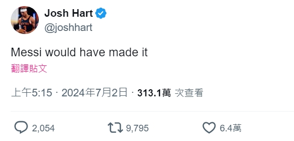 尼克斯球星哈特点评说:“如果是梅西,他能踢进。”
